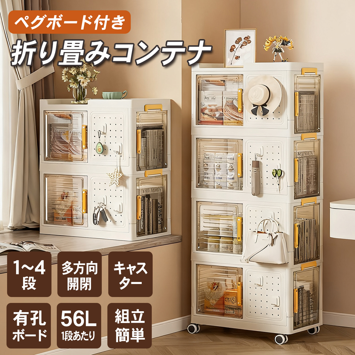 【折りたたみ×大容量×有孔ボード付き】収納ボックス キャスター付き 横扉オープン クリアタイプ スタッキング可能 工具収納 本収納 おもちゃ収納 キッチン収納 多用途 1~4段セット