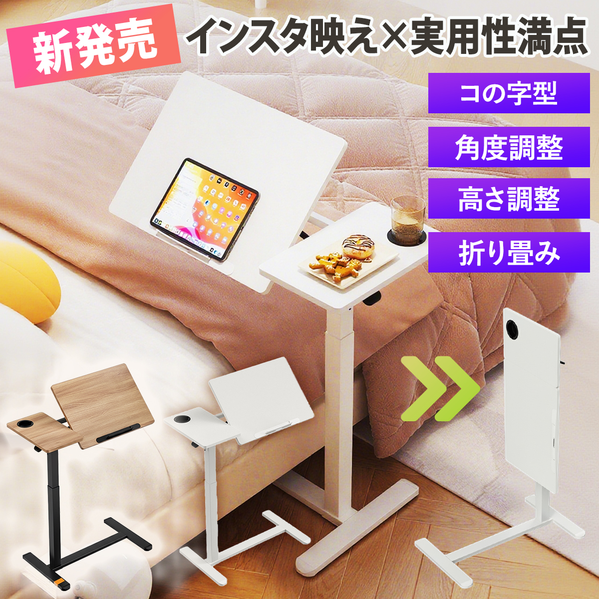 【高さ・角度 無段階調整】 サイドテーブル 昇降式 コの字型 折りたたみ キャスター付き スタンディングデスク PCテーブル 介護用 ベッドテーブル ソファテーブル おしゃれ 選べる4タイプ ホワイト/木目調 [xzzdz] - ¥37680 :