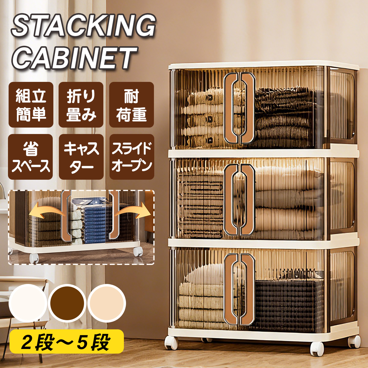 5段 【工具不要で簡単組立!】収納ボックス キャスター付き 前開き フタ付き おしゃれ 折りたたみ 大容量 コンテナ スタッキング キャビネット 衣装ケース 衣類収納 おもちゃ箱 蓋付き 透明 クリア ホワイト 扉付き 横開き 積み重ね